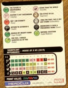 1. JLU062 Ultra-Humanite (25 points) – For 25 points you get a solid TK piece with sidestep and willpower. It also has my favorite trait of the set that reads, “INJUSTICE LEAGUE: At the beginning of your turn, roll a d6. 6: Give an action token to an opposing character that’s 100 points or less.” So there is a 1 in 6 chance every turn that this 25 point piece can give an action token to an opposing figure anywhere on the map. What I’ve mentioned so far should already be enough to justify his point cost, but he also comes with a special mind control that reads “FAR EASIER TO USE MY SUPERIOR INTELLECT AND MENTAL POWERS: Mind Control, Sidestep. When Ultra-Humanite uses Mind Control, his range value becomes 8 and he has [Improved Targeting: Hindering, Elevated, Blocking, Characters].” He can target through any type of terrain. Walls, a mountain, and the jungles of Wakanda won’t stop his mind control. If he had any defense or other support figures in the injustice league to pair him with, he would have definitely made the top ten.