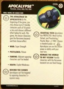 When I first saw this guy I thought he’d make a perfect primary attacker for the danger room pieces from the last X-men set. Or, he’d at least head up a really nice team of robot pieces from various sets (Ultron, I.S.S.A.C, Cyclops Sentinel, etc…) He could also be part of a very good Cadmus Labs teams with JLU058 Ace, JLU040 Amanda Waller, and JLU051E Batman Beyond. But honestly, any team could use a piece that is a great attacker and only takes one damage from opposing attacks. So lots of opportunity for this guy.