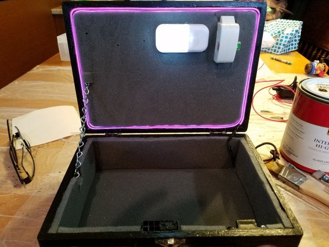 • Magnetic lock – it’s actually a child lock I found at Baby’s R’ Us. It allows the box to be locked and have no visible locking mechanism on the outside. The only way to open the box is to hold a superstong magnet in the right place. I hid a strong magnet on the back of a deadpool keychain I got off EBay. It looks like this when you open the box:
